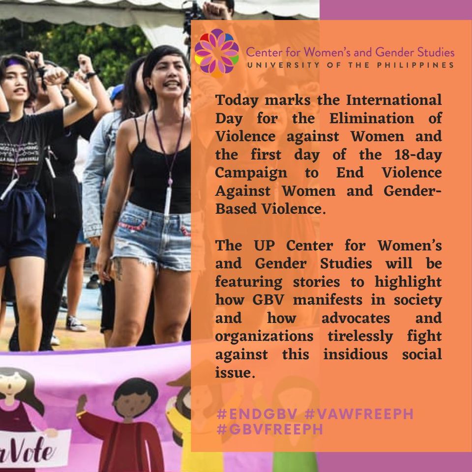 The University of the Philippines Center for Women’s and Gender Studies (UPCWGS) will be featuring stories to highlight how GBV manifests in society and how advocates and organizations tirelessly fight against this insidious social issue.