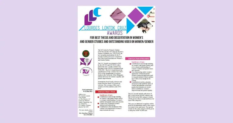 UP Center for Women’s Studies (UPCWS) and UP Center for Women’s Studies Foundation, Inc. (UPCWSFI) Welcome Nominations for the 5th Lourdes Lontok-Cruz (LLC) Awards for Best Thesis and Dissertation in Women’s and Gender Studies