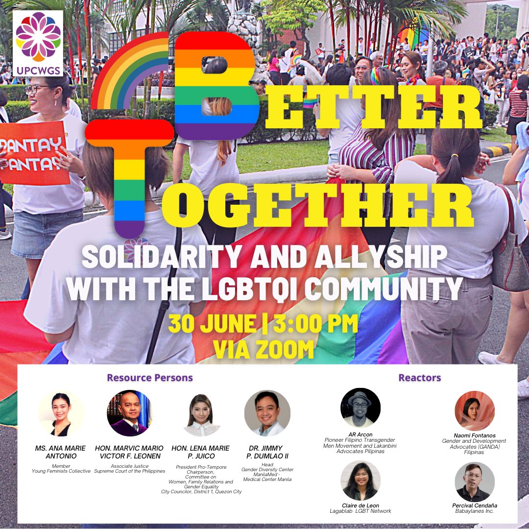 To end its celebration of Pride Month 2021 with a bang, the University of the Philippines Center for Women’s and Gender Studies (UPCWGS) brings you a webinar entitled Better Together: Solidarity and Allyship with the LGBTQI Community on 30 June 2021 (Wednesday), 3:00 PM via Zoom.