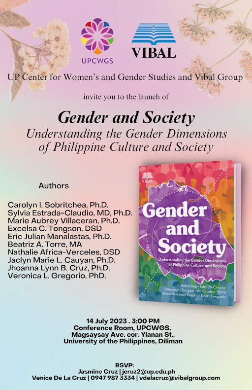 The University of the Philippines Center for Women’s and Gender Studies (UPCWGS) and the Vibal Group invite everyone to the launch of Gender and Society: Understanding the Gender Dimensions of Philippine Culture and Society on 14 July 2023 (Friday), 3:00 PM at the UPCWGS Conference Room.