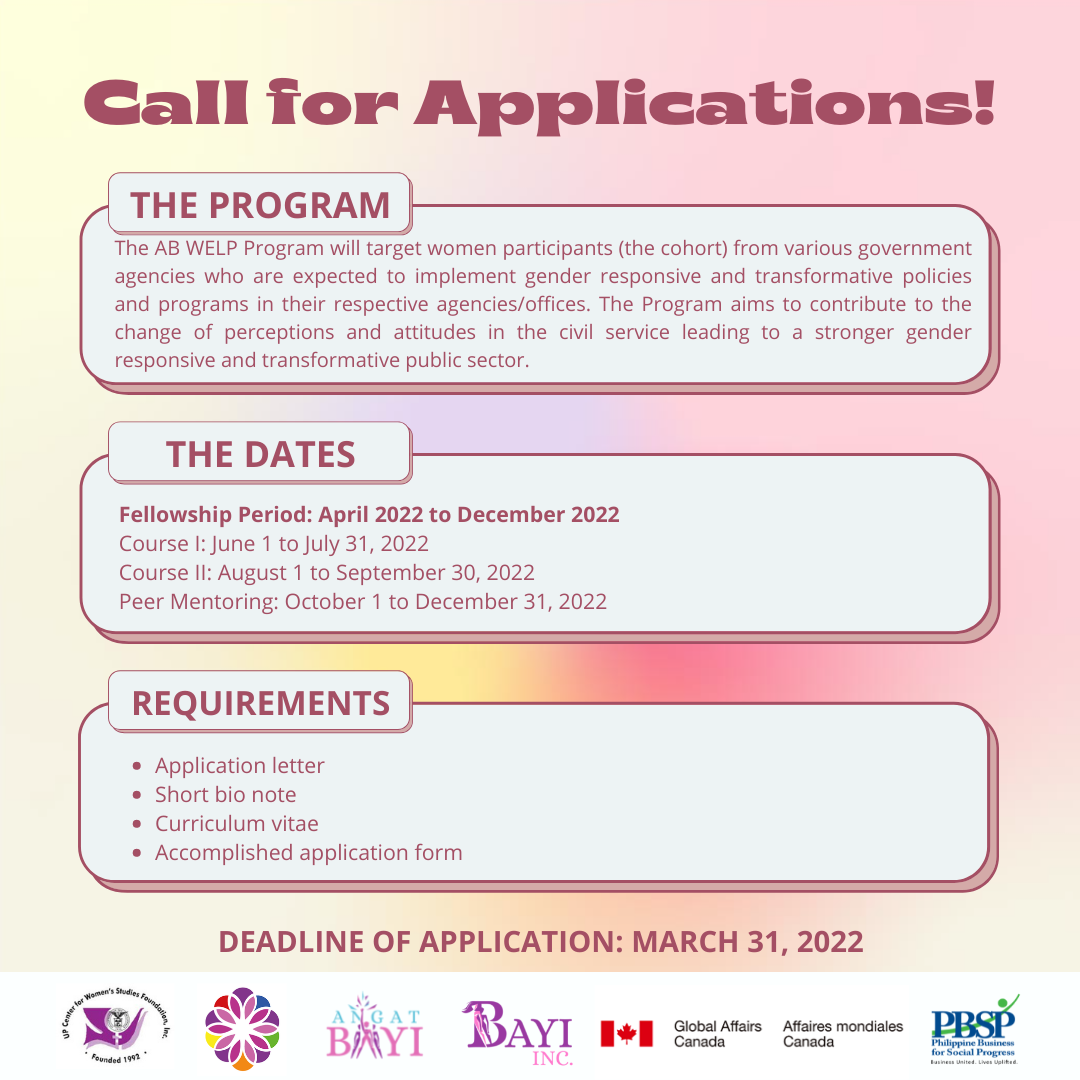 This initiative is brought to you by the University of the Philippines Center for Women’s and Gender Studies (UPCWGS), the UP Center for Women’s Studies Foundation, Inc. (UPCWSFI), and Bayi, Inc. ABWELP is supported by the Philippine Business for Social Progress (PBSP) and Global Affairs Canada.