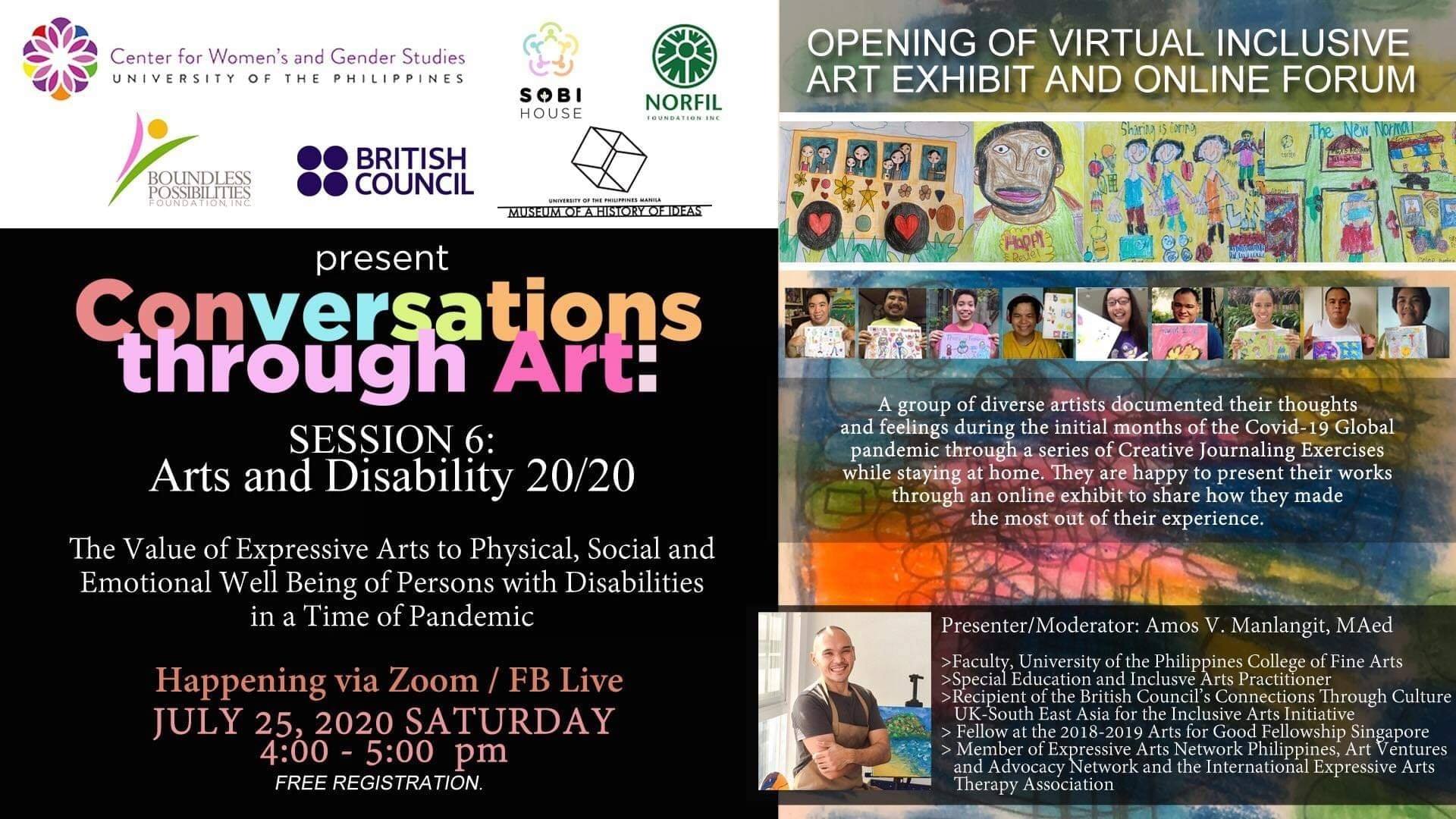 The University of the Philippines Center for Women’s and Gender Studies (UPCWGS), in partnership with the SOBI House, the NORFIL Foundation, Inc., the Boundless Possibilities Foundation, Inc., the British Council, and the UP Manila Museum of a History of Ideas, is organizing another “Conversations through Art (CTA): Tapping Various Creative Modalities for Intervention, Growth, and Transformation.” The sixth session of the discussion series, Arts and Disability 20/20: The Value of Expressive Arts to Physical, Social, and Emotional Well-Being of Persons with Disabilities in a Time of Pandemic, will be held on 25 July 2020 (Saturday), 4:00-5:00 PM via Zoom and Facebook Live. Interested participants may register at https://forms.gle/2GUZRtnsTuESfQAg7.