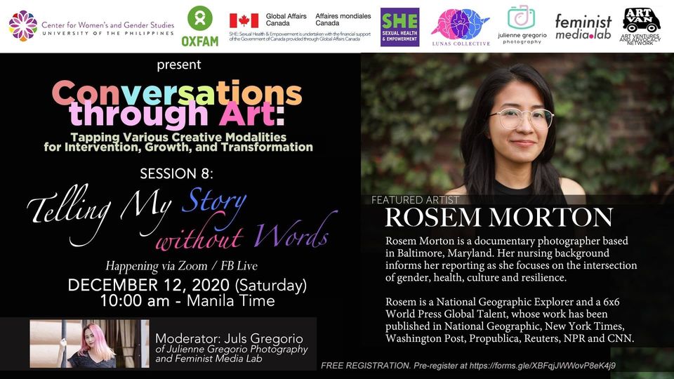 The University of the Philippines Center for Women’s and Gender Studies (UPCWGS) and Lunas Collective, in partnership with Oxfam, Global Affairs Canada, Sexual Health and Empowerment (SHE), Julienne Gregorio Photography, the Feminist Media Lab (FEMMELAB), and the Art Ventures and Advocacy Network (ART VAN), continue with the discussion series, “Conversations through Art (CTA): Tapping Various Creative Modalities for Intervention, Growth, and Transformation,” with documentary photographer Rosem Morton. She will share her survivor journey and lead an art and photography workshop to help victim-survivors take the first step towards justice, healing, and empowerment. The eighth session of the series, Telling My Story without Words, will be held on 12 December 2020 (Saturday), 10:00 AM via Zoom and Facebook Live.