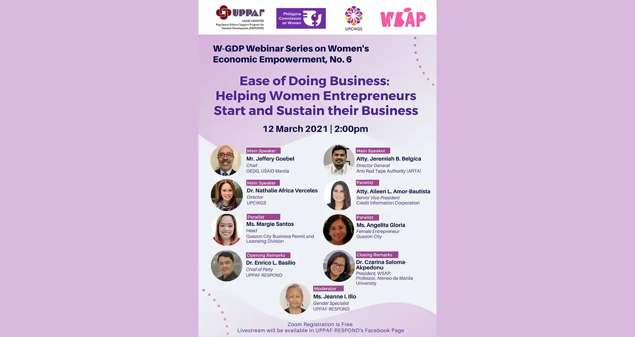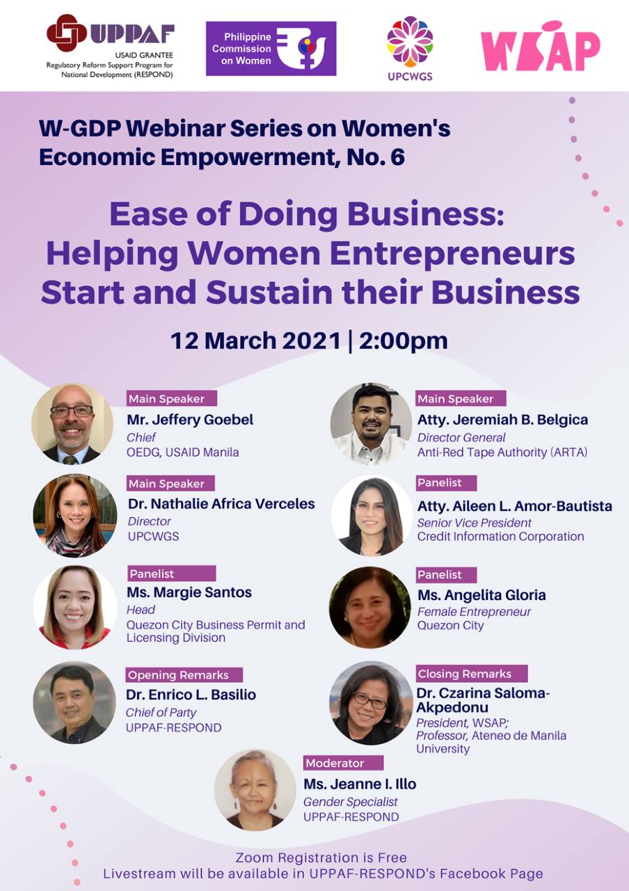 As part of its celebration of Women’s Month, the University of the Philippines Center for Women’s and Gender Studies (UPCWGS), in partnership with the UP Public Administration Research and Extension Services Foundation, Inc. (UPPAF) Regulatory Reform Support Program for National Development (RESPOND), the Philippine Commission on Women (PCW), and the Women’s and Gender Studies Association of the Philippines (WSAP), is inviting everyone to the webinar, Ease of Doing Business (EoDB): Helping Women Entrepreneurs Start and Sustain Their Business, on 12 March 2021 (Friday), 2:00-5:00 PM via Zoom and Facebook Live.