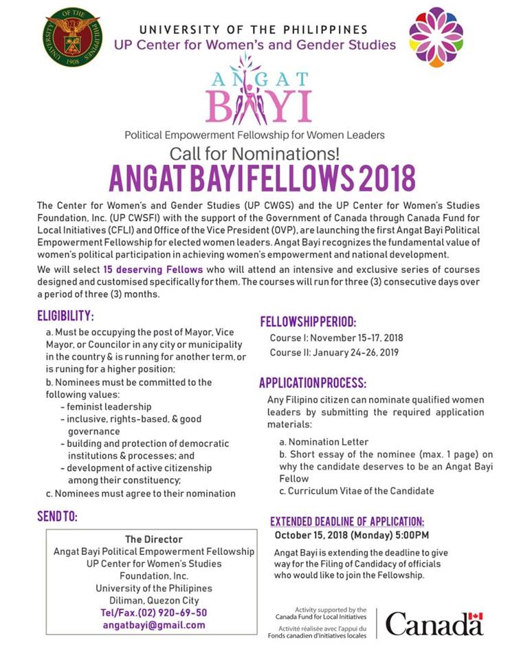 The University of the Philippines Center for Women’s and Gender Studies (UPCWGS) and the UP Center for Women’s Studies Foundation, Inc. (UPCWSFI), with the support of the Government of Canada through its Canada Fund for Local Initiatives (CFLI), and the Office of the Vice President (OVP), are launching the first Angat Bayi Political Empowerment Fellowship for elected women leaders. Angat Bayi recognizes the fundamental value of women’s political participation in achieving women’s empowerment and national development.