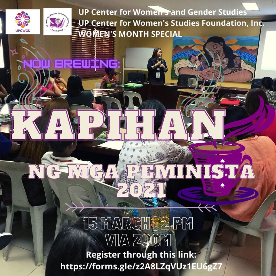 The University of the Philippines Center for Women’s and Gender Studies (UPCWGS) and the UP Center for Women’s Studies Foundation, Inc. (UPCWSFI) are organizing an online Women’s Month celebration for all generations of feminists, women’s empowerment champions, advocates, and allies entitled Kapihan ng mga Peminista 2021. The event will happen on 15 March 2021 (Monday), 2:00-4:00 PM via Zoom.