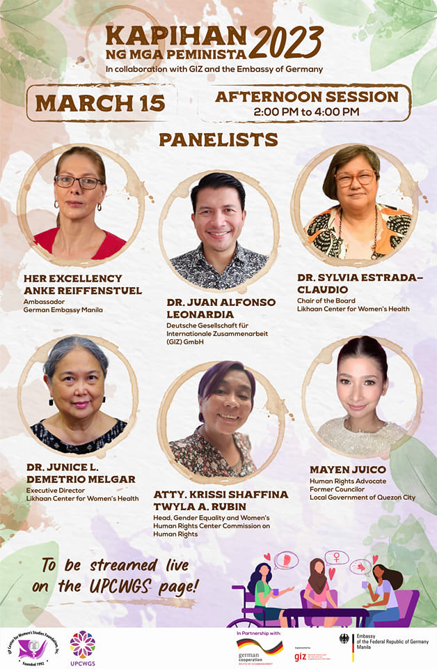 The afternoon session of the Kapihan ng mga Peminista 2023 is happening on 15 March 2023 (Wednesday), 2:00-4:00 PM at the UPCWGS Conference Room.