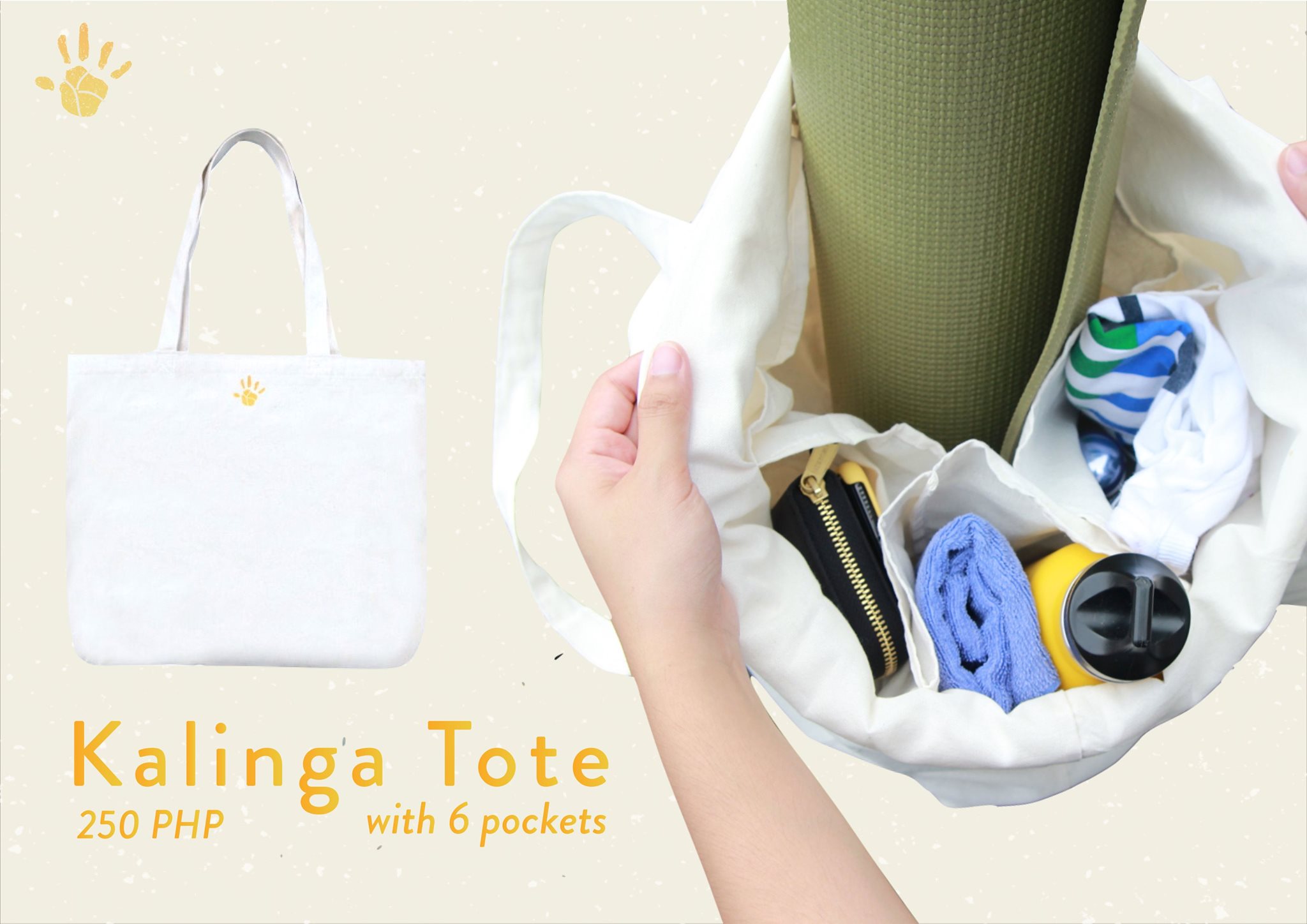 The Kalinga Tote, with a child’s handprint design, has six pockets.