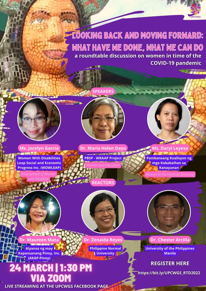 The University of the Philippines Center for Women’s and Gender Studies (UPCWGS) invites everyone to attend Looking Back and Moving Forward: What Have We Done, What We Can Do, a roundtable discussion on women in the time of the COVID-19 pandemic, on 24 March 2022 (Thursday), 1:30-3:30 PM via Zoom. This will also be live streamed at the UPCWGS Facebook page.