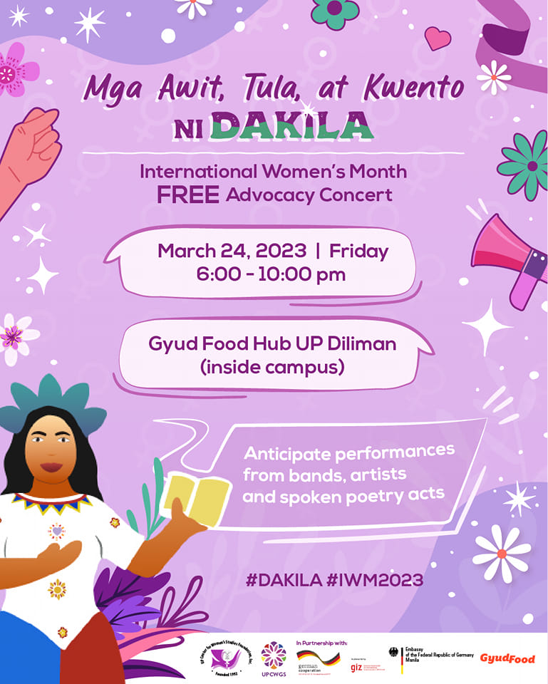 As part of its celebration of this year’s International Women’s Month, the University of the Philippines Center for Women’s and Gender Studies (UPCWGS), in partnership with Deutsche Gesellschaft für Internationale Zusammenarbeit (GIZ) Philippines and the Pacific Island Countries, the Embassy of the Federal Republic of Germany in Manila, and supported by Gyud Food Market, invites everyone to Mga Awit, Tula, at Kwento ni Dakila: An International Women’s Month Advocacy Concert on 24 March 2023 (Friday), 6:00-10:00 PM at Gyud Food Hub, UP Diliman.