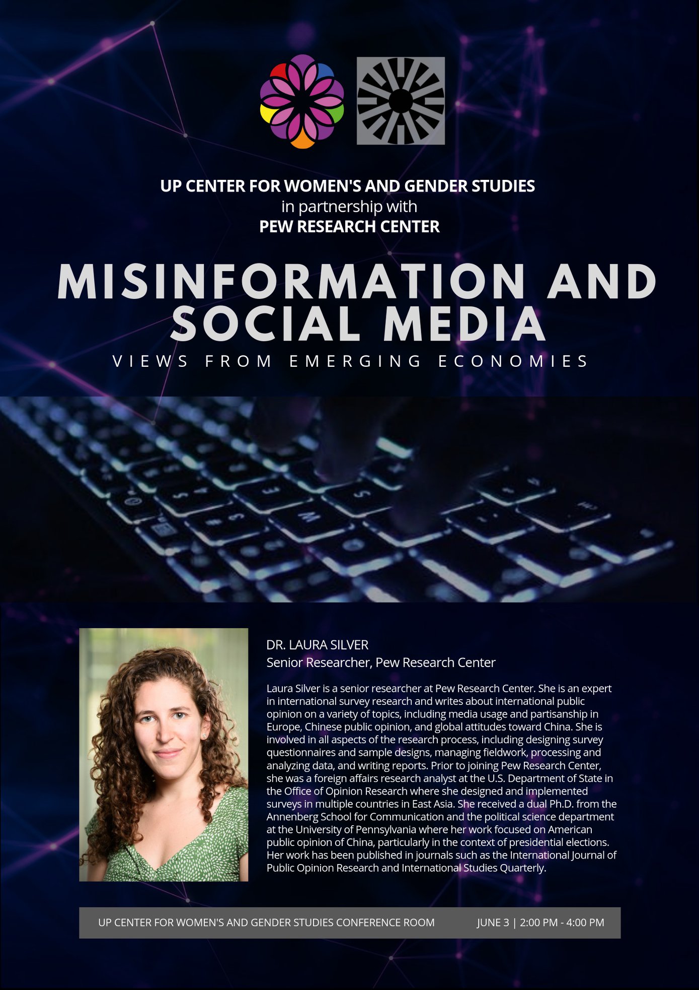 The University of the Philippines Center for Women’s and Gender Studies (UPCWGS), together with the Pew Research Center, is proud to host Dr. Laura Silver, Senior Researcher at the Pew Research Center, as she shares her insights from a survey she and her team conducted across 11 developing countries in 2018.