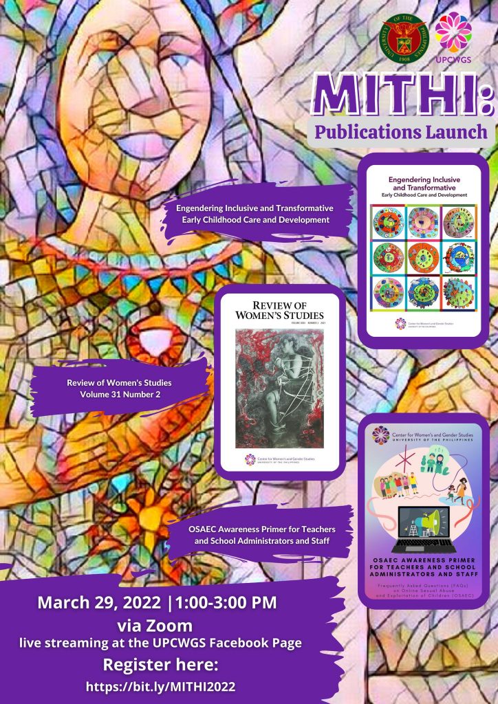 To cap off its Women’s Month celebration, the University of the Philippines Center for Women’s and Gender Studies (UPCWGS) brings you Mithi: Publications Launch on 29 March 2022 (Tuesday), 1:00-3:00 PM via Zoom. This will also be live streamed at the UPCWGS Facebook page.