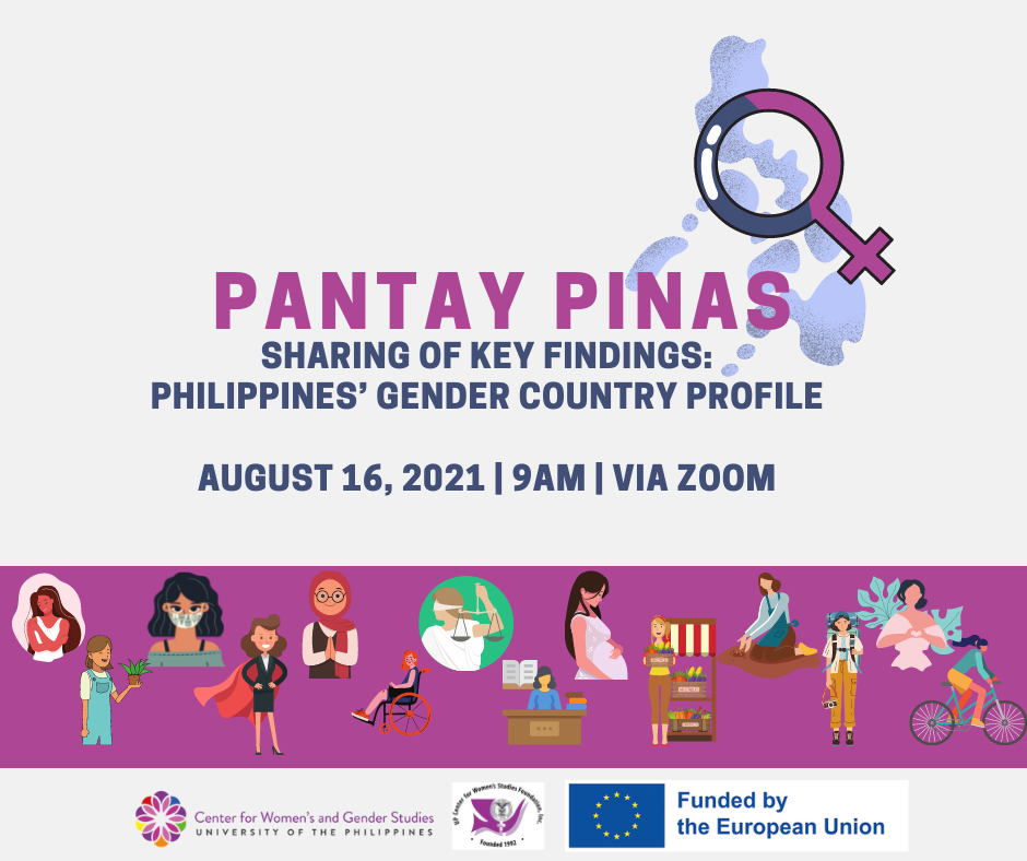 The University of the Philippines Center for Women’s and Gender Studies (UPCWGS) will hold a forum to present the 2021 Philippines’ Country Gender Profile on 16 August 2021 (Monday), 9:00-11:00 AM (Manila Time, UTC+8) via Zoom. The forum, entitled Pantay Pinas: Sharing of Key Findings of the Philippines’ Gender Country Profile 2021, will be the research dissemination of the update to the 2016 Gender Country Report of the Philippines.