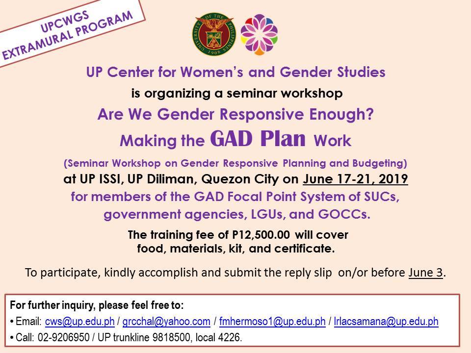 The University of the Philippines Center for Women’s and Gender Studies (UPCWGS) is organizing a seminar-workshop, “Are We Gender Responsive Enough? Making GAD Agenda Work (Seminar-Workshop on Gender-Responsive Planning and Budgeting),” on 17-21 June 2019 at the Institute for Small-Scale Industries (ISSI), UP Diliman for members of the GAD Focal Point System of SUCs, government agencies, LGUs, and GOCCs.
