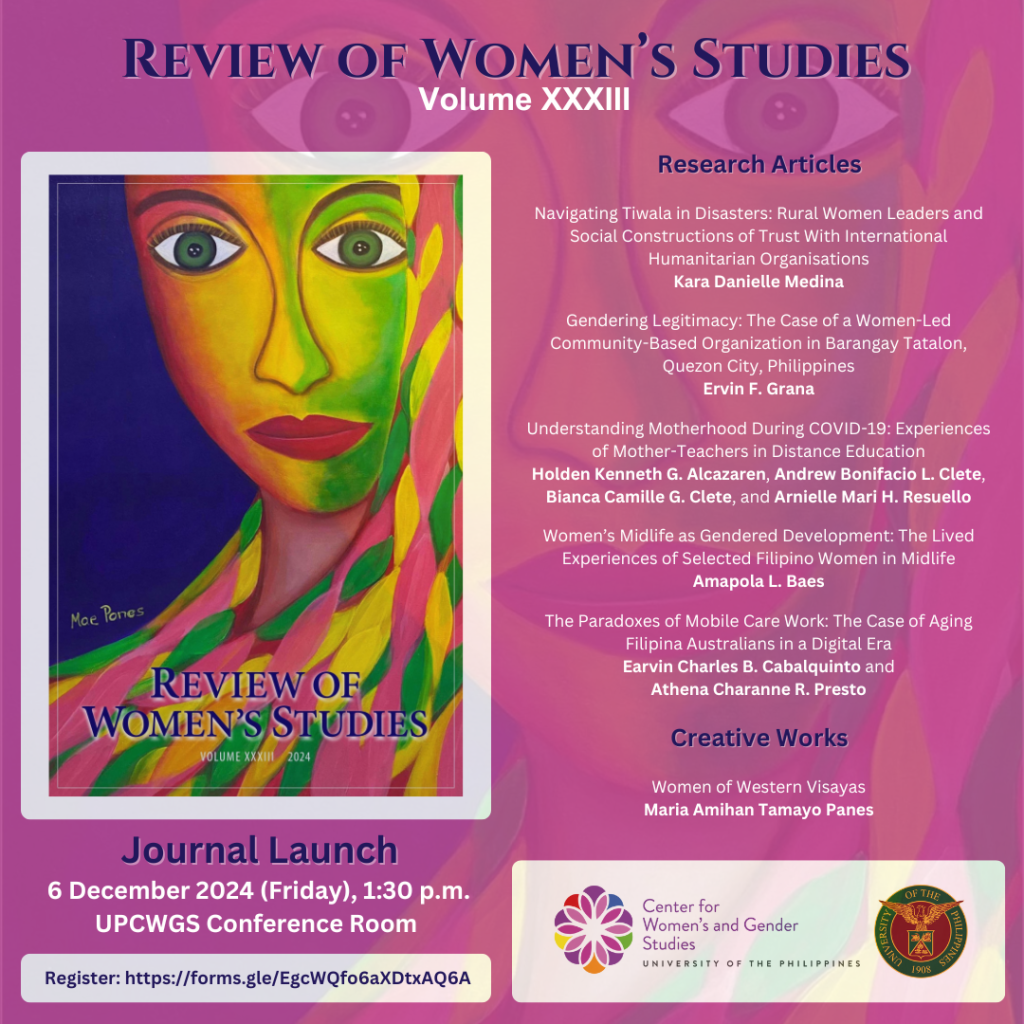 As part of its founding anniversary celebration, the University of the Philippines Center for Women’s and Gender Studies (UPCWGS) invites everyone to the launch of the latest issue of its journal, the Review of Women’s Studies Volume XXXIII, on 6 December 2024 (Friday), 1:30 PM at the UPCWGS Conference Room.