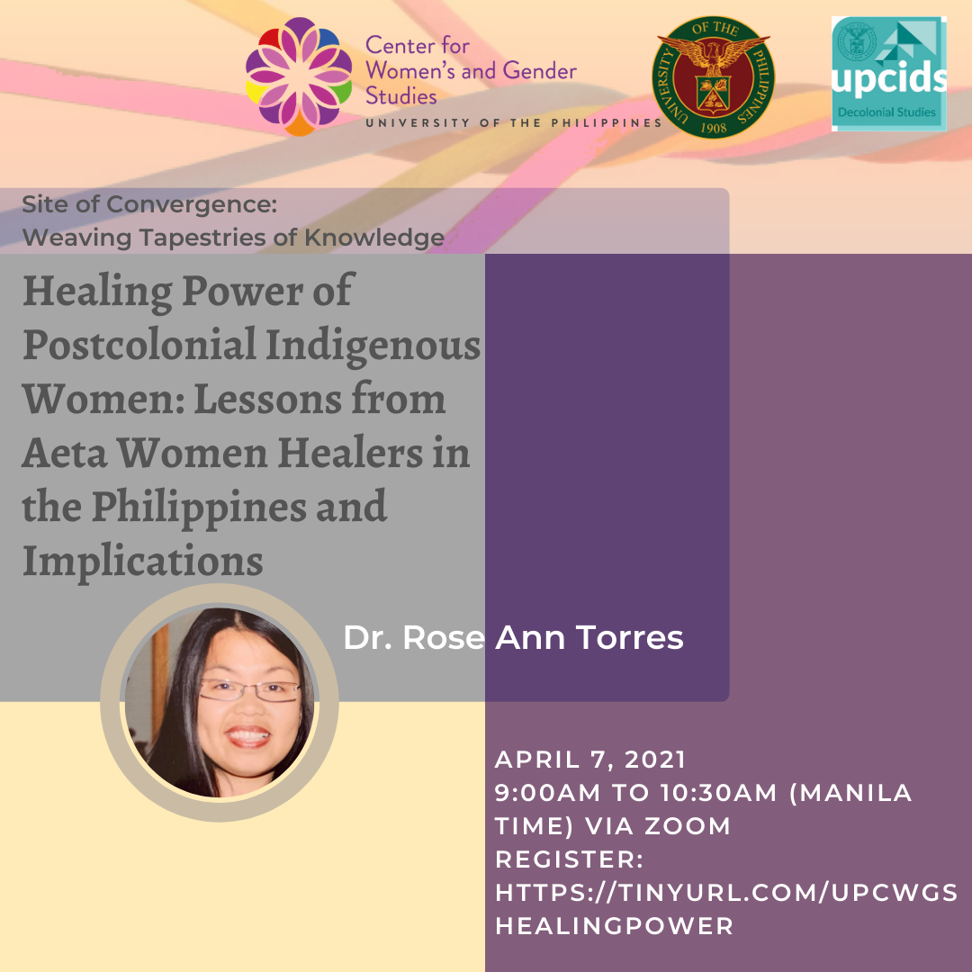 The University of the Philippines Center for Women’s and Gender Studies (UPCWGS), in partnership with the UP Center for Integrative and Development Studies (CIDS) Decolonial Studies Program, invites everyone to the webinar, Healing Power of Postcolonial Indigenous Women: Lessons from Aeta Women Healers in the Philippines and Implications, by Dr. Rose Ann Torres. The third session of the lecture series, “Site of Convergence: Weaving Tapestries of Knowledge,” the event will be held on 7 April 2021 (Wednesday), 9:00-10:30 AM (Manila Time) via Zoom.