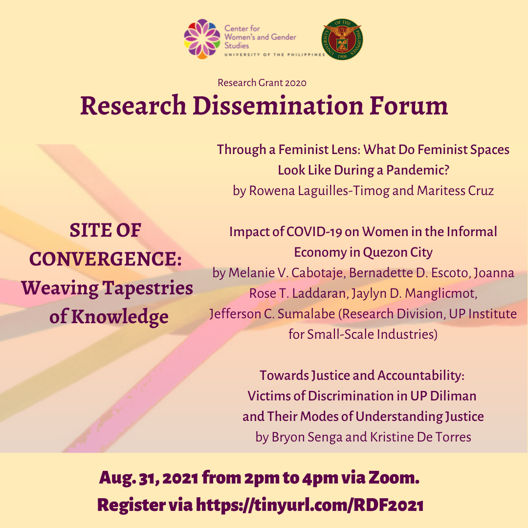 The University of the Philippines Center for Women’s and Gender Studies (UPCWGS) invites everyone to the UPCWGS Research Dissemination Forum on 31 August 2021 (Tuesday), 2:00-4:00 PM via Zoom. Featuring the research projects of our 2020 Research Grantees, this event is the fifth session of the lecture series, “Site of Convergence: Weaving Tapestries of Knowledge.”