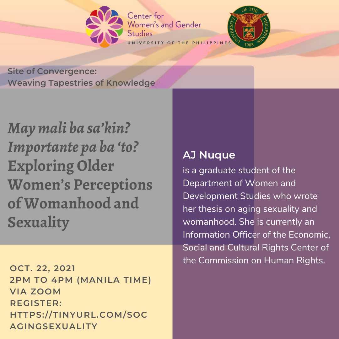 The University of the Philippines Center for Women’s and Gender Studies (UPCWGS) invites everyone to May mali ba sa ‘kin? Importante pa ba ‘to? Exploring Older Women’s Perceptions of Womanhood and Sexuality on 22 October 2021 (Friday), 2:00-4:00 PM (Manila Time) via Zoom. This event is the sixth session of the lecture series, “Site of Convergence: Weaving Tapestries of Knowledge.”