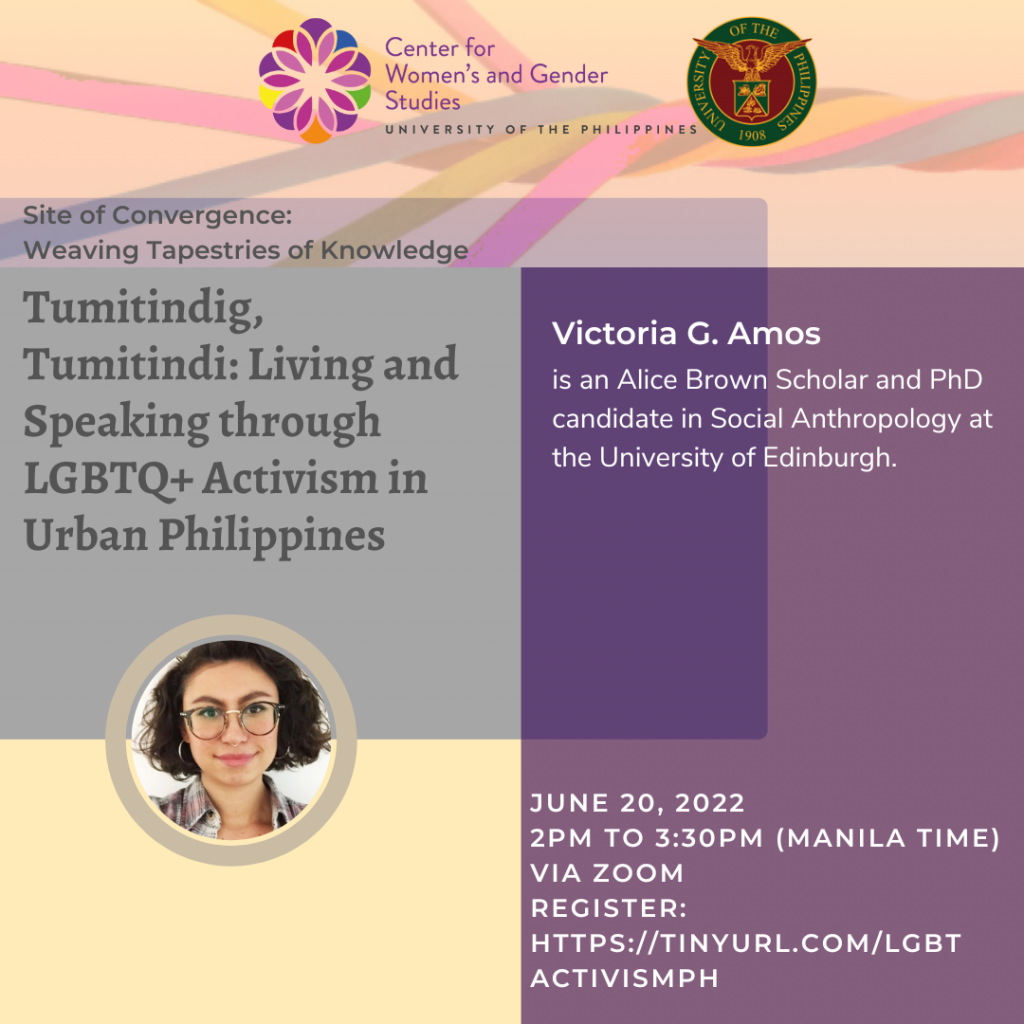 The University of the Philippines Center for Women’s and Gender Studies (UPCWGS) invites everyone to Tumitindig, Tumitindi: Living and Speaking through LGBTQ+ Activism in Urban Philippines on 20 June 2022 (Monday), 2:00-3:30 PM (Manila Time) via Zoom. This event is the seventh session of the “Site of Convergence: Weaving Tapestries of Knowledge” lecture series.