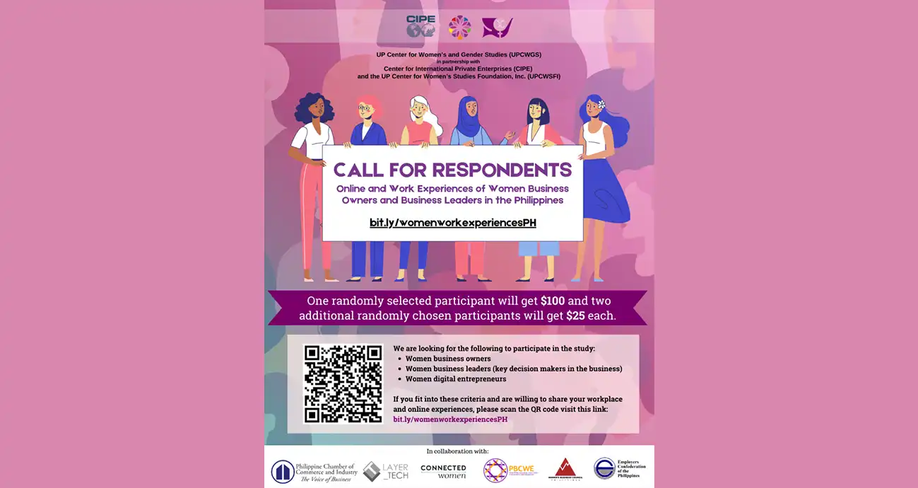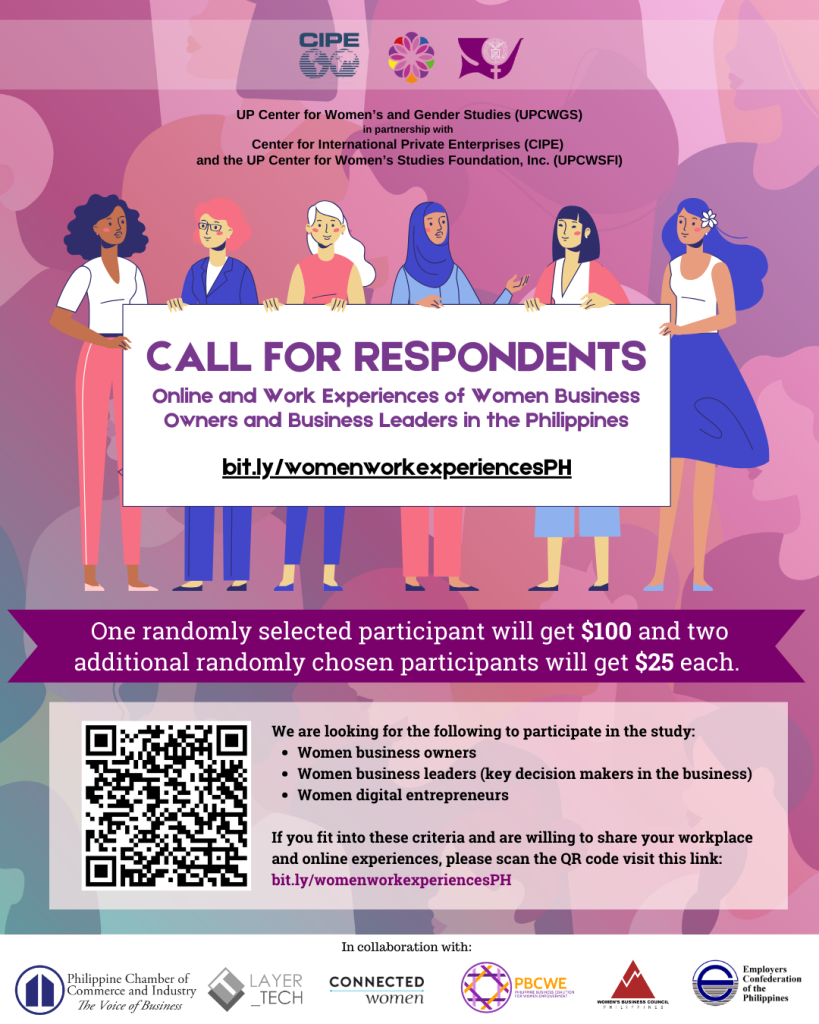 Our survey is still ongoing! The University of the Philippines Center for Women’s and Gender Studies (UPCWGS), in collaboration with the UP Center for Women’s Studies Foundation, Inc. (UPCWSFI) and the Center for International Private Enterprises (CIPE), is conducting a study focusing on the online and workplace experiences and safety of women in the Philippines.