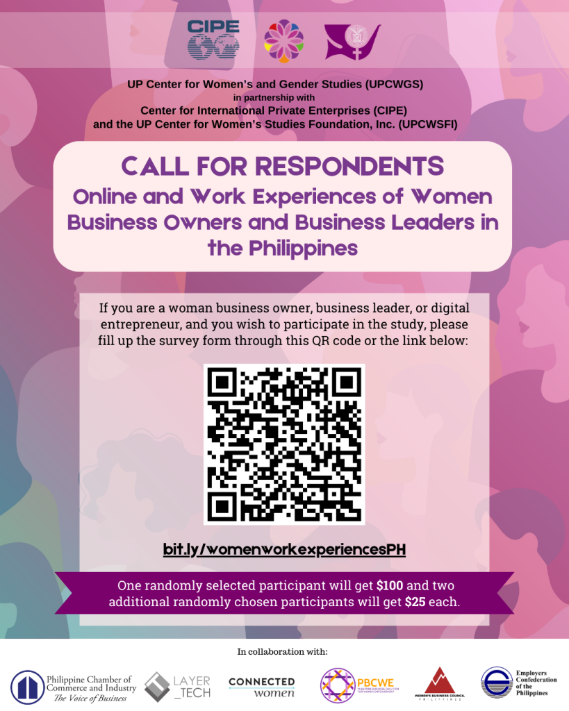 The University of the Philippines Center for Women’s and Gender Studies (UPCWGS), in partnership with the UP Center for Women’s Studies Foundation, Inc. (UPCWSFI) and the Center for International Private Enterprises (CIPE), is conducting a survey that aims to gather information on the online and workplace experiences and safety of women in the Philippines. We are looking for women business owners, business leaders, and digital entrepreneurs to take part in the study. Rest assured that all responses will be kept confidential.