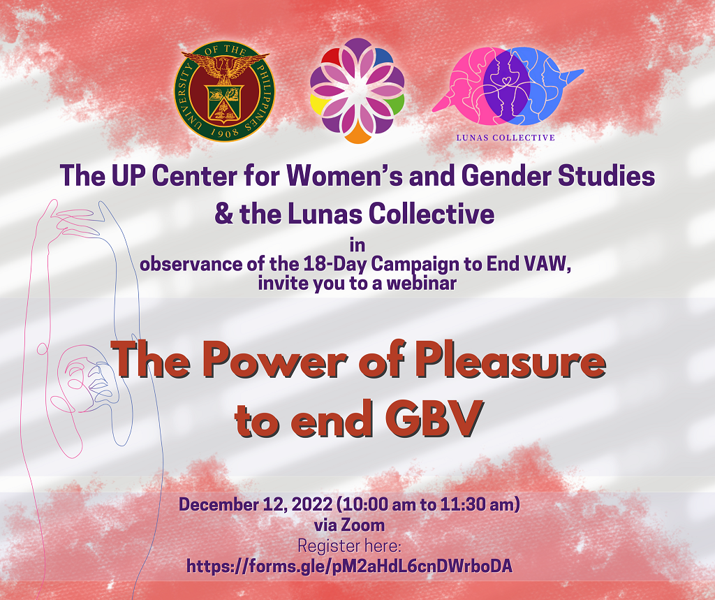 The University of the Philippines Center for Women’s and Gender Studies (UPCWGS) and Lunas Collective, in observance of the 18-Day Campaign to End Violence against Women (VAW), invite everyone to a webinar, The Power of Pleasure to End Gender-Based Violence (GBV), on 12 December 2022 (Monday), 10:00-11:30 AM via Zoom. Resource speaker is Prof. Sabrina Laya S. Gacad, Chairperson of the Department of Women and Development Studies, College of Social Work and Community Development, UP Diliman.