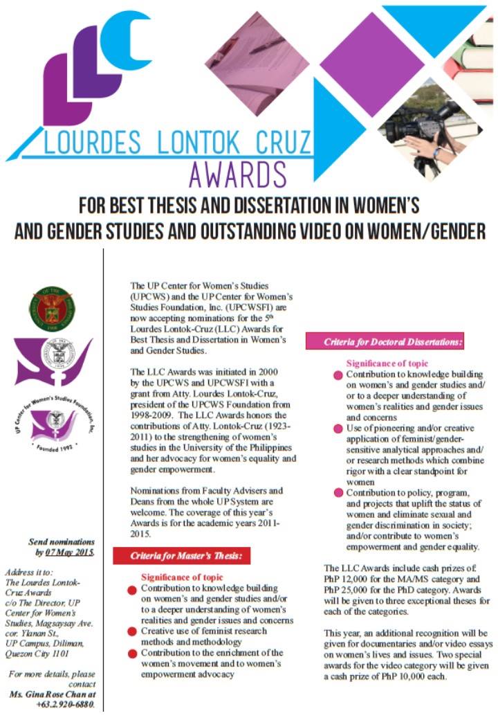 The LLC Awards was initiated in 2000 by the UPCWS and UPCWSFI with a grant from Atty. Lourdes Lontok-Cruz, president of the UPCWS Foundation from 1998-2009. The LLC Awards honors the contributions of Atty. Lontok-Cruz (1923-2011) to the strengthening of women’s studies in the University of the Philippines and her advocacy for women’s equality and gender empowerment.