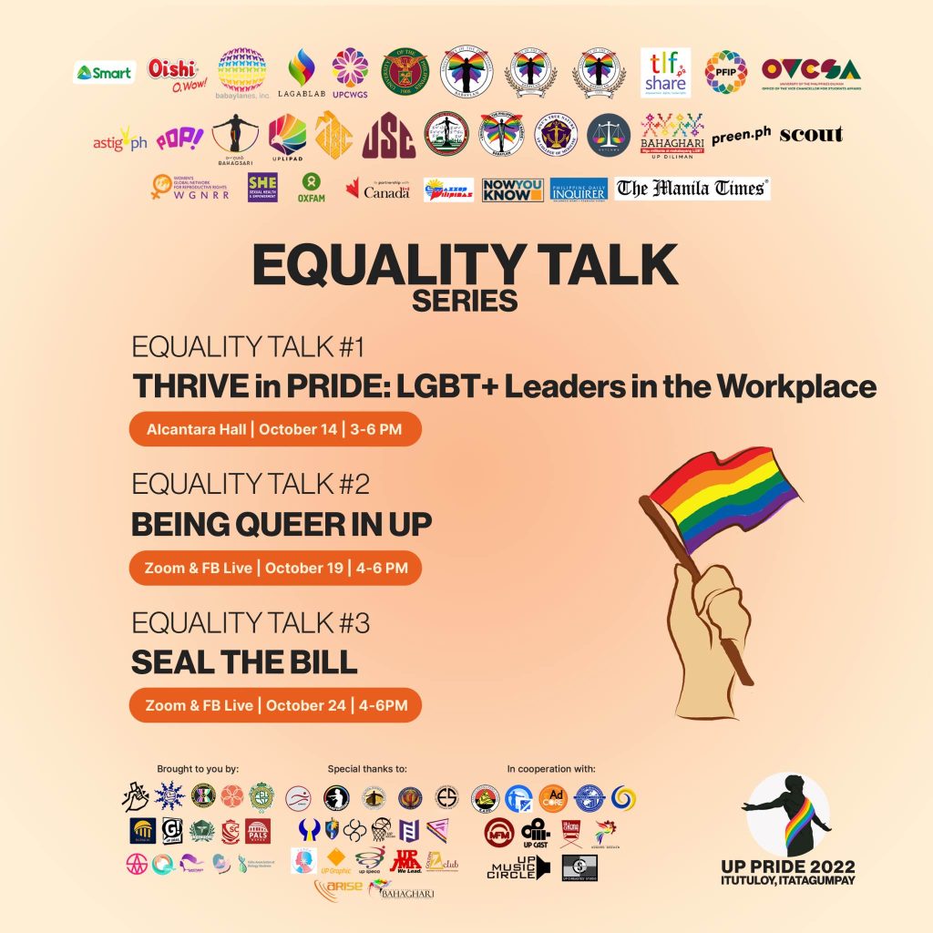 Equality Talk #1 Thrive in Pride: LGBT+ Leaders in the Workplace October 14 (Friday), 3:00-6:00 PM Alcantara Hall (Student Union Building), UP Diliman