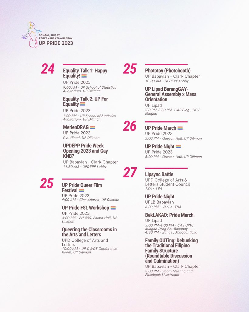 Here is the official lineup of events for UP Pride 2023! These are made possible in coordination with the different LGBTQI organizations in the UP System.