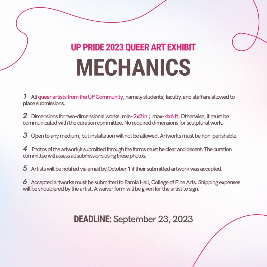 Get a chance to adorn Parola: Fine Arts Gallery with stunning rainbows! For this year’s UP Pride, celebrate by submitting your (queer!) artworks for the upcoming UP Pride Queer Art Exhibit. Let the world see your creative prowess by filling out the form in the link: https://tinyurl.com/Queer-Art-Exhibit. Deadline for submissions is on 23 September 2023.