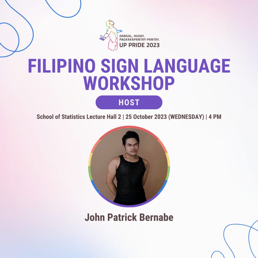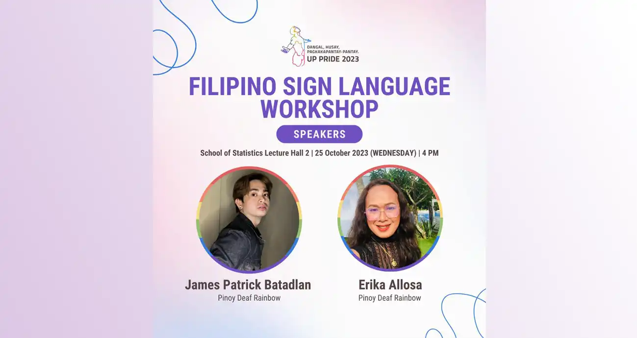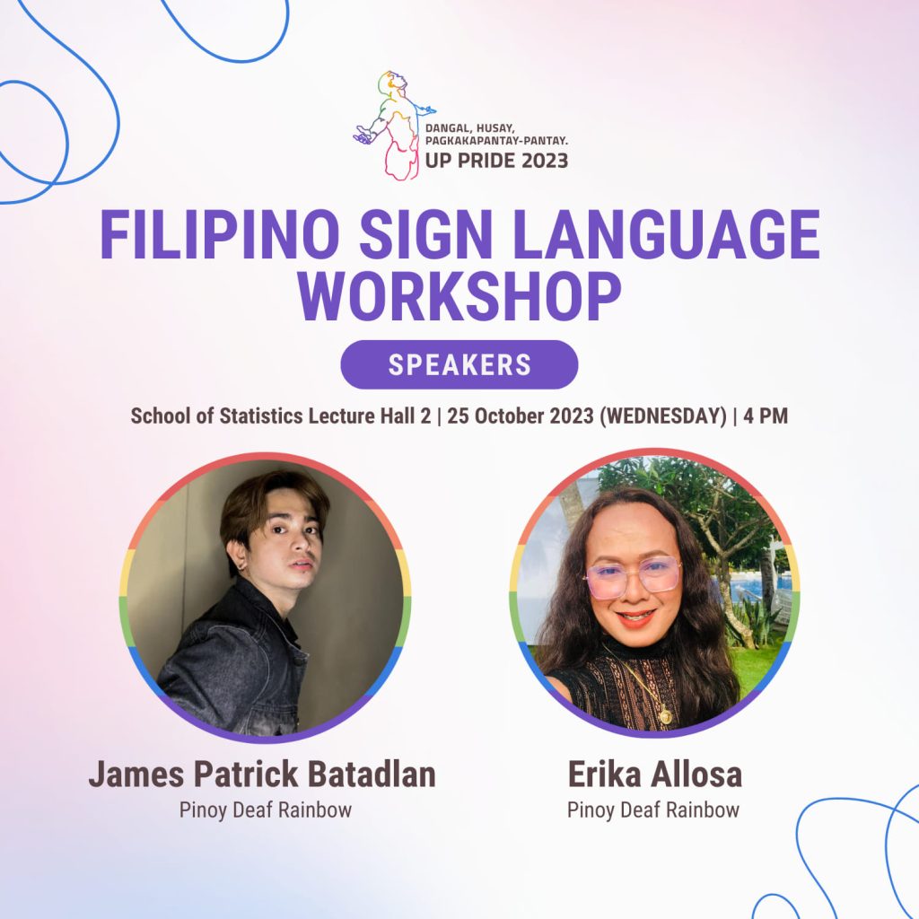 Join us today, 25 October 2023 (Wednesday), 4:00-7:00 PM at the School of Statistics Lecture Hall 2 for the Filipino Sign Language Workshop. Learn basic FSL and the history of queer deaf culture in the Philippines with speakers from Pinoy Deaf Rainbow: Erika Allosa and James Patrick Batadlan.