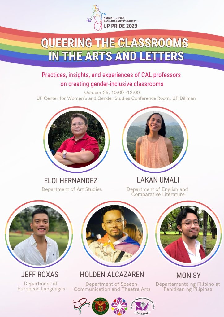 In celebration of UP Pride 2023, the University of the Philippines (UP) Diliman College of Arts and Letters, in partnership with the UP Center for Women’s and Gender Studies (UPCWGS) and UP Pride, will hold a lecture series on Queering the Classrooms in the Arts and Letters. Five faculty members from the College will share their best practices, insights, and experiences in teaching courses of their expertise from a gender-sensitive standpoint: Prof. Eloisa May Hernandez of the Department of Art Studies, Ms. Lakan Umali of the Department of English and Comparative Literature, Asst. Prof. Jeff Roxas of the Department of European Languages, Asst. Prof. Holden Kenneth Alcazaren of the Department of Speech Communication and Theatre Arts, and Asst. Prof. Jose Monfred Sy of the Departamento ng Filipino at Panitikan ng Pilipinas. This will take place on 25 October 2023 (Wednesday), 10:00 AM – 12:00 NN at the UPCWGS Conference Room.