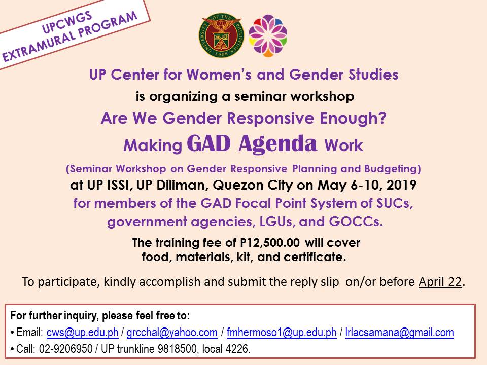 The University of the Philippines Center for Women’s and Gender Studies (UPCWGS) is organizing a seminar-workshop, “Are We Gender Responsive Enough? Making GAD Agenda Work (Seminar-Workshop on Gender-Responsive Planning and Budgeting),” on 6-10 May 2019 at the Institute for Small-Scale Industries (ISSI), UP Diliman for members of the GAD Focal Point System of SUCs, government agencies, LGUs, and GOCCs.