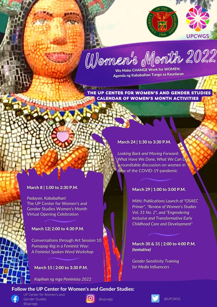 The University of the Philippines Center for Women’s and Gender Studies (UPCWGS) brings you its calendar of activities for this year’s Women’s Month celebration: